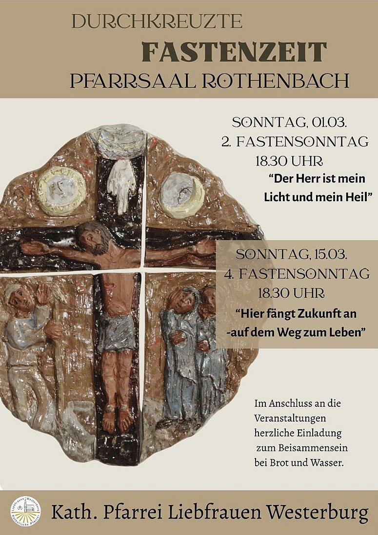 Die Veranstaltungen finden im Pfarrsaal in Rothenbach statt. Anschließend laden wir ein, bei Brot und Wasser noch etwas zusammen zu bleiben.